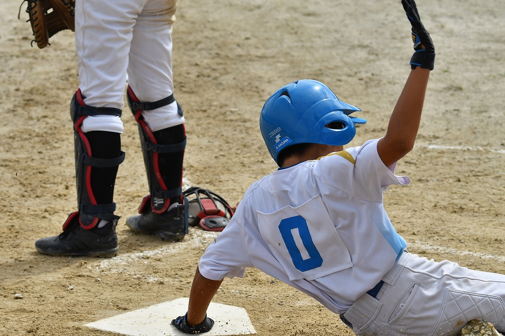 そして運命のプレーが・・・ツーアウトランナー2塁、バッターはカズマ。打った打球はサードへ!サードが取って一塁送球~!終わったか・・・と思ったその瞬間。ボールは左にそれ、一塁手が手を伸ばしてキャッチ。判定は~~「セ~~~~フ!!」オフザバック!!(足がベースから離れた判定)その間にジョーがホームイン!1点返す!!これは、監督から「どんな時も全力で」と言われている選手達、カズマが全力疾走で駆け抜けたから起こった奇跡です!!